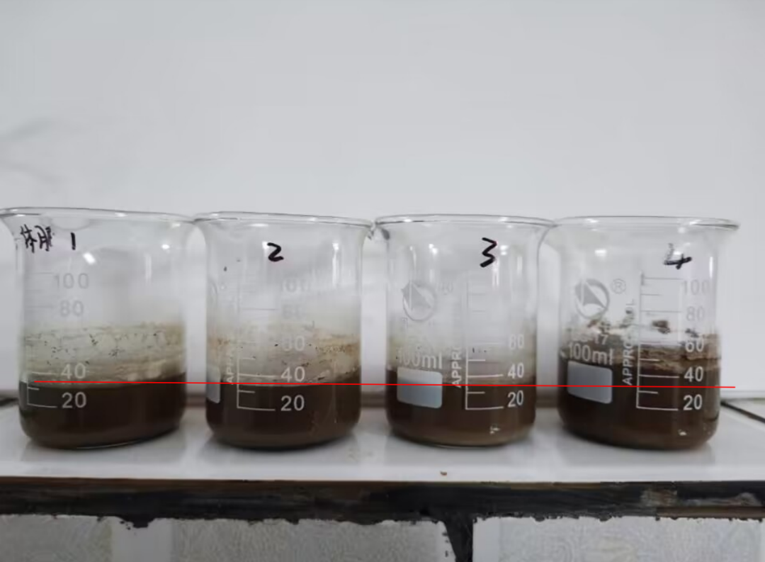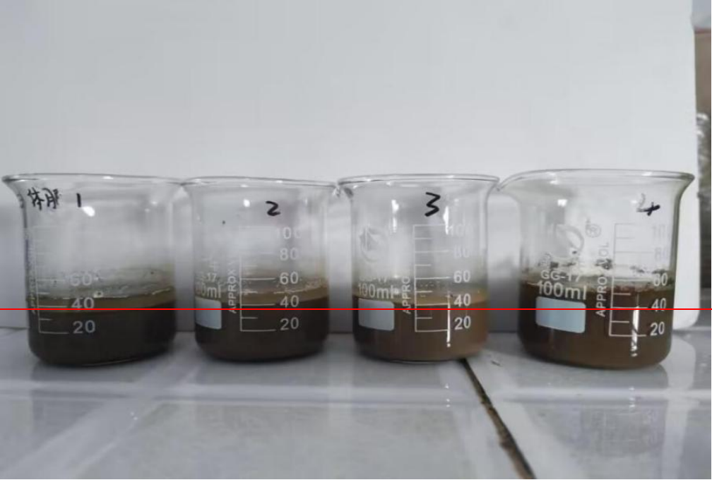 試驗方法:取相同板結地塊過0.5mm篩40g土樣4份加入4個100ml燒杯中,加水20ml,充分攪拌后靜置沉淀。