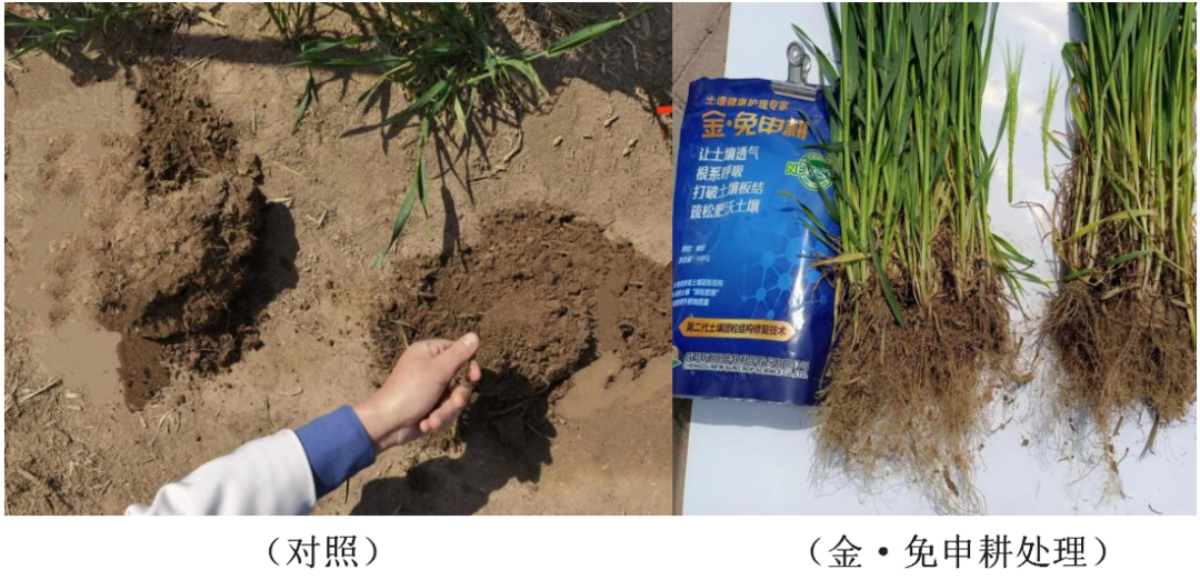 試驗結果:金·免申耕使用后的土壤明顯疏松,小麥長勢強,分蘗多,根系好。